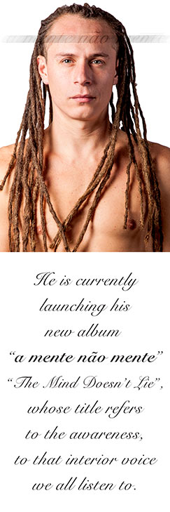 He is currently launching his new album “A Mente Nao Mente” (The Mind Doesn’t Lie), whose title refers to the awareness, to that interior voice we all listen to. His album is based on stringed instruments and on worldwide percussion instruments; the lyrics are about the evolution of mankind, race and ethnicity awareness, spiritual evolution and, above all, unity between people.